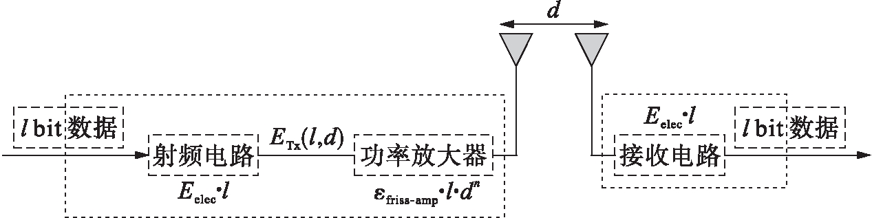网络节点能耗采用文献[13]中提出的无线通信能耗模型,如图1所示.模型由功率放大器和射频电路组成,前者能耗根据收发节点间距离的不同分为自由空间模型和多路径衰减模型.自由空间模型的路径损耗指数为2(d2功耗),多路径衰减模型的路径损耗指数为4(d4功耗).使用哪种模型取决于通信距离,若通信距离小于门限值,则使用自由空间模型.