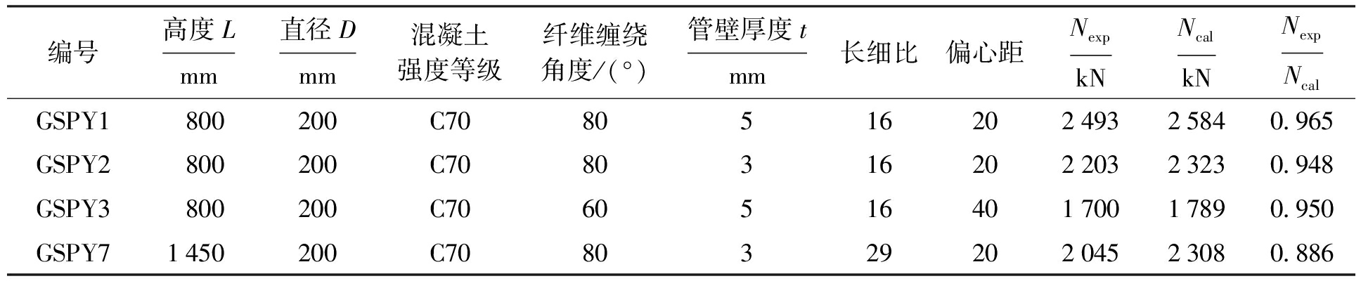 编号高度Lmm直径Dmm混凝土强度等级纤维缠绕角度/(°)管壁厚度tmm长细比偏心距NexpkNNcalkNNexpNcalGSPY1800200C708051620249325840.965GSPY2800200C708031620220323230.948GSPY3800200C706051640170017890.950GSPY71450200C708032920204523080.886