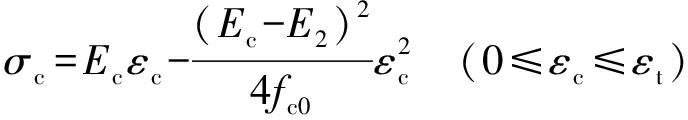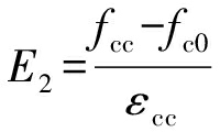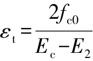 式中:Ec为混凝土的初始弹性模量,取Ec=为混凝土圆柱体抗压强度;εt为第一阶段与第二阶段分界点处所对应的应变;fc0和fcc分别为无约束和约束混凝土的峰值应力;E2为第二阶段曲线斜率;其他变量含义见文献[8].峰值应力和峰值应变计算公式为