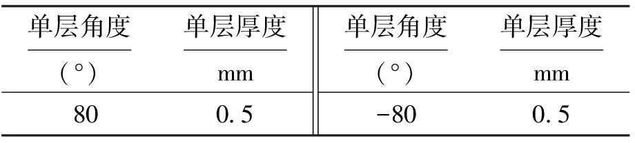 GFRP管采用ABAQUS中的单层板模型来模拟其力学性能,ABAQUS定义复合材料的损伤采用Hashin破坏准则[9],用来近似模拟复合材料的损伤演化过程,单层板的相关参数利用复合材料细观力学中的分析方法,由文献[10]中提供的材料参数计算,并对GFRP管进行铺层设计,铺层设计以3 mm厚角度为80°的GFRP管为例,铺层方式及情况如图2和表1所示,从而完成对GFRP管的定义.