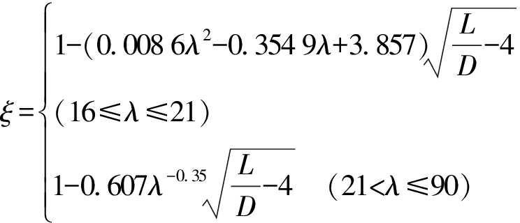 由图6可知,偏压柱的承载力随长细比的增加而下降,构件由强度破坏逐渐向失稳破坏转变,当16<λ<21时,承载力变化较快,此时构件主要发生强度破坏,随着长细比逐渐增大,构件极限承载力降低,为此二阶效应的作用也逐渐降低,承载力变化减慢.对有限元计算结果和试验数据进行回归处理,得到柱承载力与长细比有关的折减系数公式为
