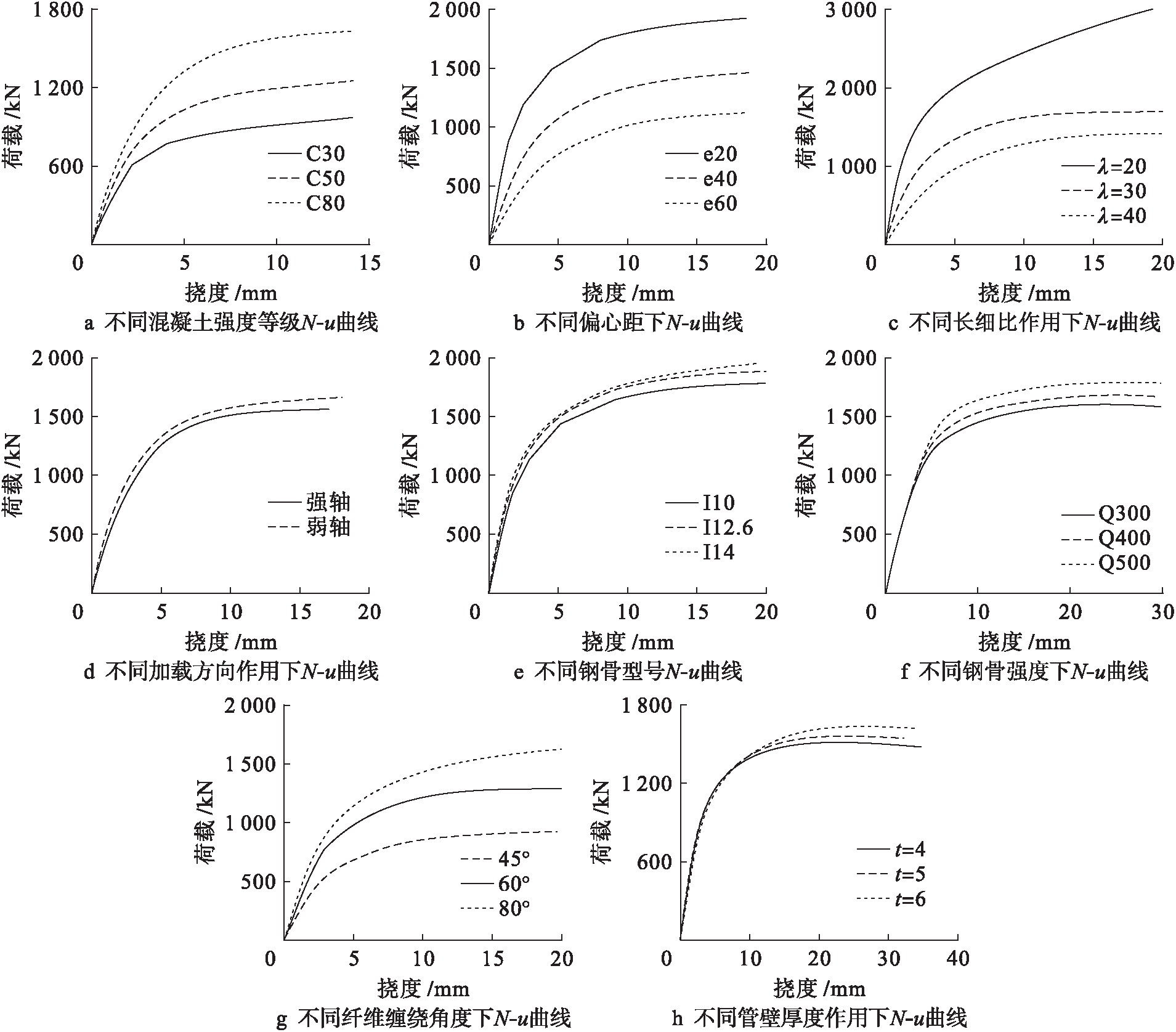 6) 钢骨强度的影响.由图5f可知,在受力初期,核心混凝土承载,钢骨和GFRP管未参与工作,此时的N-u曲线完全重合,混凝土弹性段过后,钢骨的强度作用开始显现,强度高钢骨承受较高荷载.