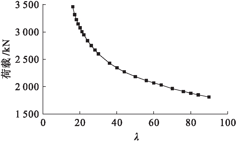本文基于规范选取λ=16为短柱和长柱的界限值,由于当λ<16时,构件的承载力主要由材料本身强度决定,故本文主要计算受长细比影响较大的λ>16构件,改变构件长细比,承载力与长细比(N-λ)关系曲线如图6所示.