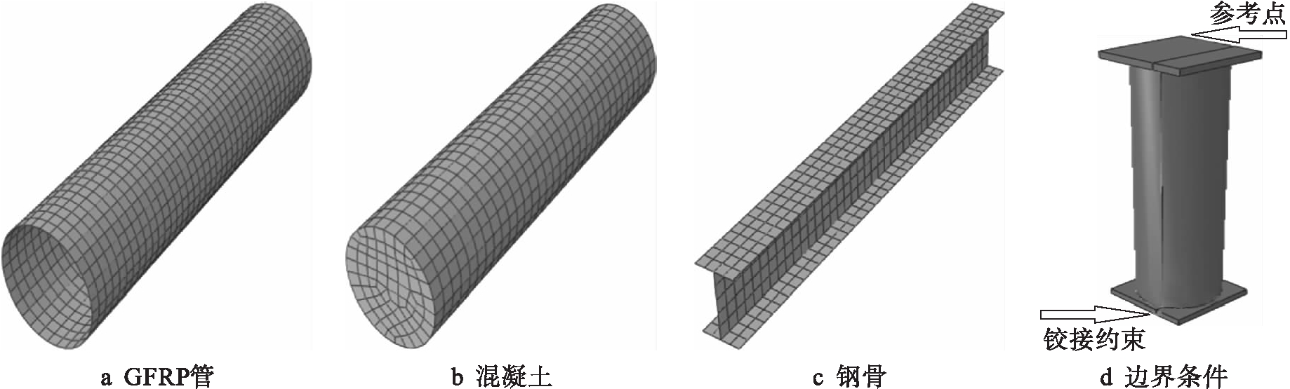 混凝土和垫块采用八节点六面体减缩积分单元(C3D8R),型钢和GFRP管采用四节点减缩积分壳单元(S4R),厚度方向均采用5个积分点的泊松积分.对钢骨使用Embed命令实现与核心混凝土的作用,GFRP管与端板采用shell to solid coupling命令接触,用tie命令将混凝土与端板进行绑定,端板按照实际偏心距切割加载线,上端板加载线耦合参考点,并在参考点处施加位移荷载,下端板加载线处施加铰接边界条件,网格划分及边界条件如图3所示.