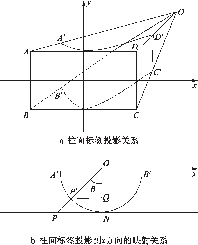 在同一视点O将图像投影到柱面切平面上的原理图如图1所示.图1a为柱面标签投影关系,柱面A′B′C′D′投影到切平面ABCD上;图1b为柱面上任意一点P′投影到切平面x方向的映射关系.