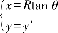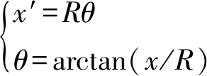 首先建立理想的投影模型,图1b假设圆柱面A′B′为半圆,焦距ON=R,中心点为O,曲面图像上任意一点P′投影到平面图像上的P点(x方向即由P′所对应的弧长投影到平面PN的长度),OP与ON间的夹角θ.柱面标签投影到切平面x方向映射关系表达式为