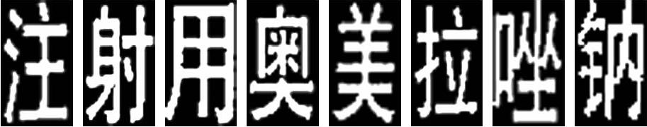 对图9中经过预处理的图像进行字符切分,药品名字符分割图如图10所示.图10中,药品名字符得到正确切分.字符分割后需要与模板字符进行匹配,需要提前做出模板字符库,图11为药瓶标签注射用奥美拉唑钠的部分模板库图像.