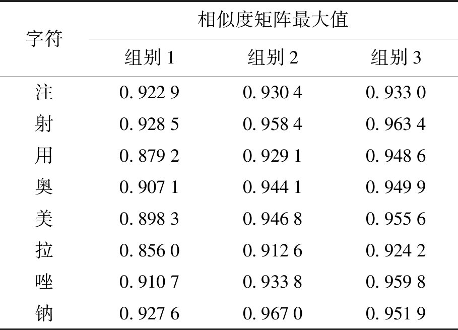 字符相似度矩阵最大值组别1组别2组别3注0.92290.93040.9330射0.92850.95840.9634用0.87920.92910.9486奥0.90710.94410.9499美0.89830.94680.9556拉0.85600.91260.9242唑0.91070.93380.9598钠0.92760.96700.9519