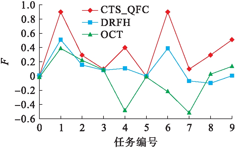 用户满意度比较结果如图4所示.F=0表明用户获得了与期望一致的资源分配量;F>0表明用户获得了高于期望值的资源分配量;F<0表明用户没有获得与期望相符合的资源分配量.可以看出,CTS_QFC算法得到的资源分配结果更加符合用户的期望;OTC算法未考虑公平性分配问题,在任务4与7上均没有得到满足期望的资源分配;DRFH算法公平性方面强于OTC算法而弱于本文算法CTS_QFC,只有任务8上没有得到期望资源分配,主要原因在于DRFH算法仅考虑了性能较强的占优资源的公平性分配问题.