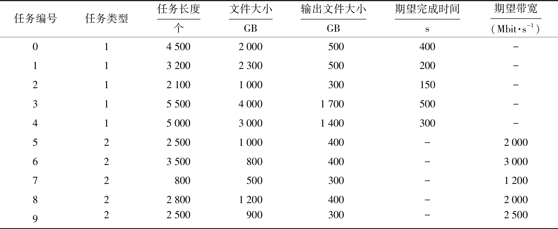 任务编号任务类型任务长度个文件大小GB输出文件大小GB期望完成时间s期望带宽(Mbit·s-1)0145002000500400-1132002300500200-2121001000300150-31550040001700500-41500030001400300-5225001000400-2000623500800400-300072800500300-12008228001200400-2000922500900300-2500