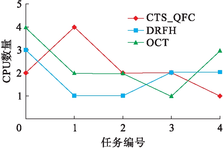 图5为第1类任务0~4所获得的CPU数量的对比图.可以看出,CTS_QFC算法可以更好地满足第1类任务对计算能力的需求,以更好的公平性满足用户的QoS偏好.另外两种算法并未对任务按照QoS偏好进行分类,所分配的CPU数量只与用户任务本身的要求相关,与任务的QoS偏好是无关的,其资源分配量是随机的.