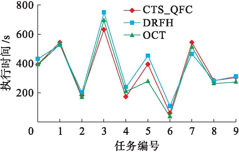 各算法任务完成时间如图3所示.整体看来,CTS_QFC算法的执行效率差于OCT算法,但对于任务0~4,由于对计算能力的QoS偏好,其执行时间依然短于OCT算法.DRFH算法只注重公平性而忽略了执行效率,其执行时间普遍长于本文算法.