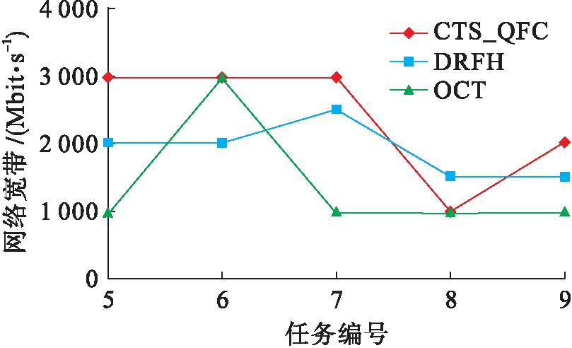 图6为第2类任务5~9所获得的网络带宽量的对比图.可以看出,该组任务对高带宽拥有更高要求,CTS_QFC算法能够更好地满足其对该类资源的需求,以更好的公平性满足用户的QoS偏好.