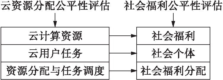 云计算中实体主要包括:用户、资源提供者及调度系统,与之对应的研究目标则为用户任务、资源以及调度策略.将社会福利分配公平性理论与云计算的资源分配问题进行映射,如图1所示.此时需要解决的问题是用户任务的分类、任务公平性函数的定义、资源与任务的参数化以及任务与资源间的映射.