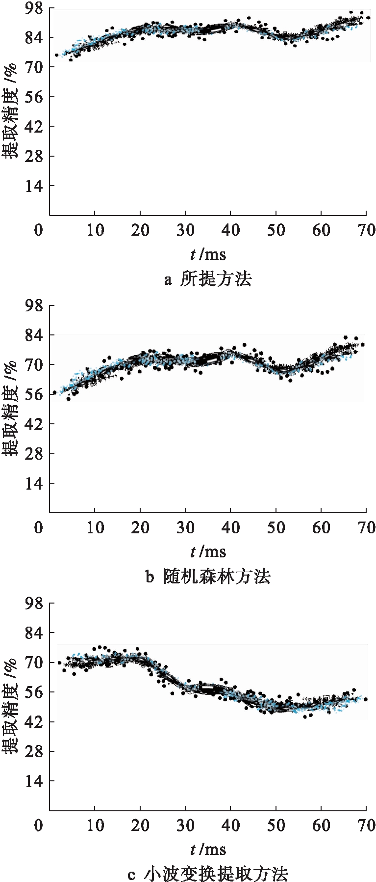为充分验证本文方法的优势,选取特征信息提取精度和特征信息提取时间为指标进行对比,特征信息提取精度对比结果如图6所示.由于图像特征点分布呈现离散化状态,所以对特征点提取精度结果也对应使用离散点进行表示.