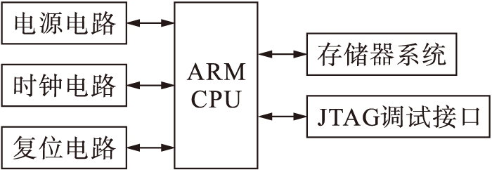 除了ARM核心处理器和扩招模块之外,还应配备满足系统正常运行的外围最小系统电路,如图3所示,主要有电源电路、时钟电路、存储器系统、JTAG接口和复位电路等模块,其中电源电路为各个子系统提供电力支撑,所需要的直流电压等级有12、5、3.3和1.8 V.