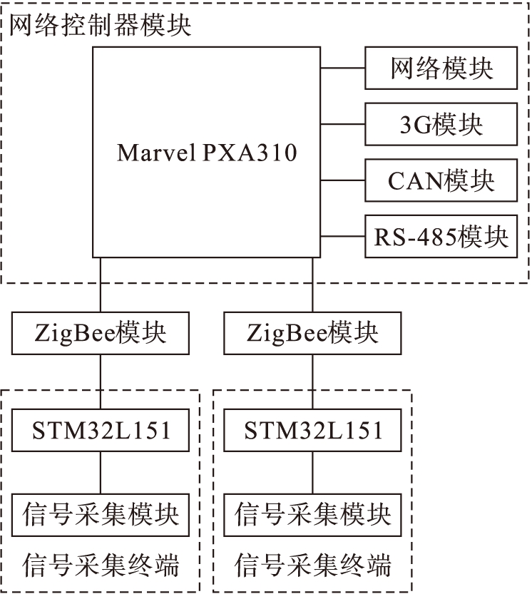 根据系统的功能需求,选用型号为Marvel PXA310的ARM9作为核心处理器[7]来构建网络控制器的最小系统,外围扩展功能模块主要有网络模块、3G模块、CAN模块、RS-485模块以及ZigBee模块[8-9],其中ZigBee模块用于数据采集终端,是无线传感器网络的协调器.