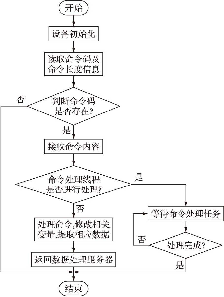 网络控制系统中通信任务的主体流程图如图6所示,首先将各自通信设备打开并对其初始化,初始化之后便开始等待服务器发送命令,若出现命令,便对命令码和命令长度进行读取,以判断该命令码是否存在.如果存在命令码,则根据命令长度接收命令内容,再一次判断该命令是否需由命令处理线程进行处理,直至处理成功.