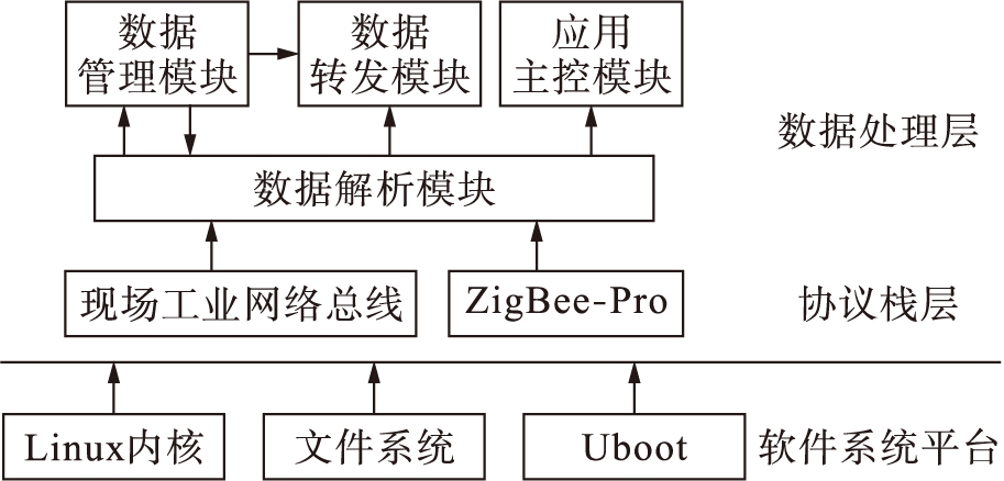 基于物联网的网络控制器软件部分主要是在硬件的基础上,实现不同通信协议的转换以及完成数据采集终端、监控中心的连接,将嵌入式Linux操作系统植入到ARM处理器,实现所有程序的统一管理.网络控制器系统的软件结构如图4所示,软件平台在Linux系统上实现,主要包括数据处理层和协议栈层,协议栈包含的协议有以太网协议、ZigBee-Pro协议等,数据处理层主要是对数据进行管理和转发.