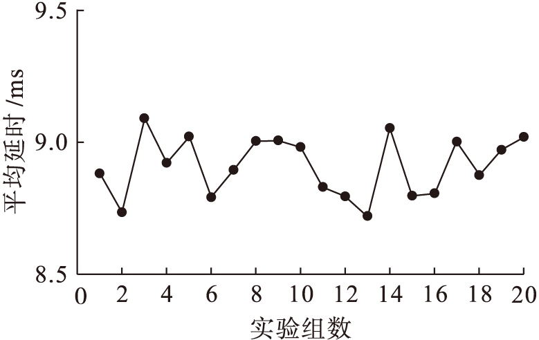 由图8可知,20次实验结果的平均丢包率为0.27%,测试结果远低于中国通信标准化协会规定的最大丢包率1%,因此满足要求.由图9可知,20次实验结果的平均时延分别为:8.878 49、8.736 04、9.100 39、8.928 68、9.023 81、8.788 69、8.896 75、8.998 92、9.010 12、8.981 02、8.828 06、8.789 18、8.729 23、9.058 92、8.796 78、8.812 13、8.997 91、8.879 26、8.971 52、9.019 82 ms,也低于规定平均时延的最大值100 ms,因此也满足要求.综上所述,文中所设计的网络控制器系统能够满足实际应用的要求.