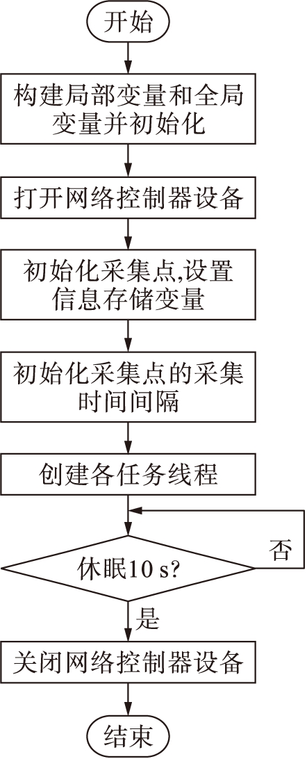 嵌入式系统的核心部分是网络控制器的主应用程序,主要功能包括:各种不同通信模块之间协调传输、不同通信协议之间转换以及数据信息采集功能.所有的程序采用Linux C进行编写,系统软件部分最开始运行的是主函数部分,主函数首先完成变量的定义以及初始化,然后完成各个子模块的对应功能,并使主函数进入死循环,其流程图如图5所示.