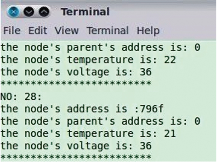 首先,本文对网络控制器的主控模块进行了测试,网络控制器主控模块主要是接收Zigbee传送的数据,并通过解析将其发送至IP网络.网络控制器IP地址为192.168.139.72,终端网络客户端的IP地址是192.168.139.73,通过解析后得到的数据结果如图7所示.从图中可以看出,节点的网络地址、网络控制器Zigbee模块的地址以及节点电压、温度等信息能够有效读取.该测试结果表明,该网络控制器能够实现Zigbee无线网络和IP网络的联通.