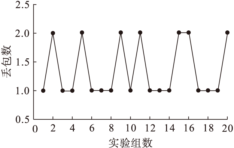 在基于物联网的网络控制系统中,网络传感器读取串口数据的丢包率以及网络控制器与以太网之间的数据传输延时是两个重要的指标,为验证系统的可行性和有效性,对两项指标进行了性能测试.本次实验测试中,设置了20组不同的无线传感器网络节点,数据信息的发送周期为5 s,以1 000个数据包为一个间隔来测量丢包率,第1~1 000个数据包记为第1组,第1 001~2 000个数据包记为第2组,以此类推,第19 001~20 000个数据包记为第20组,两项指标的实验结果如图8、9所示.