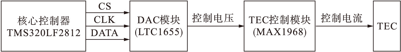 目前,市场上出现多种专用的TEC控制芯片,它们都具有精度高、使用方便、功率大等优点.本系统采用美信公司生产的TEC控制芯片,型号为MAX1968,其内部集成1.5 V的稳压源,流过TEC的电流大小和方向与输入控制端口电压值一一对应.DAC模块是连接TEC控制芯片与微处理器的桥梁.微控制器计算出的数字量经过D/A变换成模拟量,该模拟量作用于TEC芯片控制端口,与MAX1968内部电路一起构成电流控制电路,实现激光器温度的恒定控制.温度控制单元组成框图如图2所示.