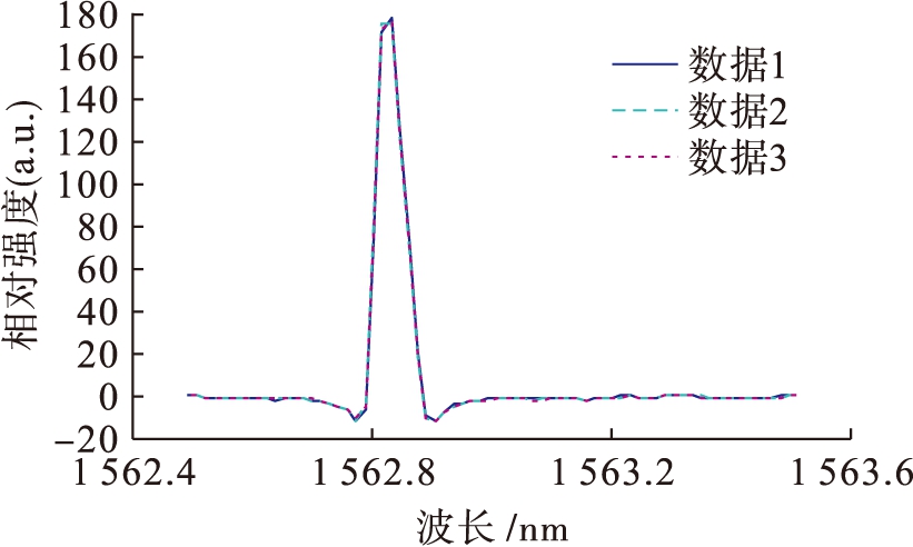 在气体浓度检测实验中,为了保证系统的检测精度并提高系统的可靠性,需要对半导体激光器输出稳定的发光光谱,这完全由激光器的温控系统决定.利用本文自主研发的温度控制系统,对同一个半导体激光器的输出光谱连续三次进行测量,测量的时间间隔为1 h.测量结果如图10所示,其中,设定激光器的工作温度为39 ℃,工作电流为60 mA.由实验结果分析可知,测得的三条激光器输出谱线几乎完全重合,说明该激光器温控系统的稳定性良好.