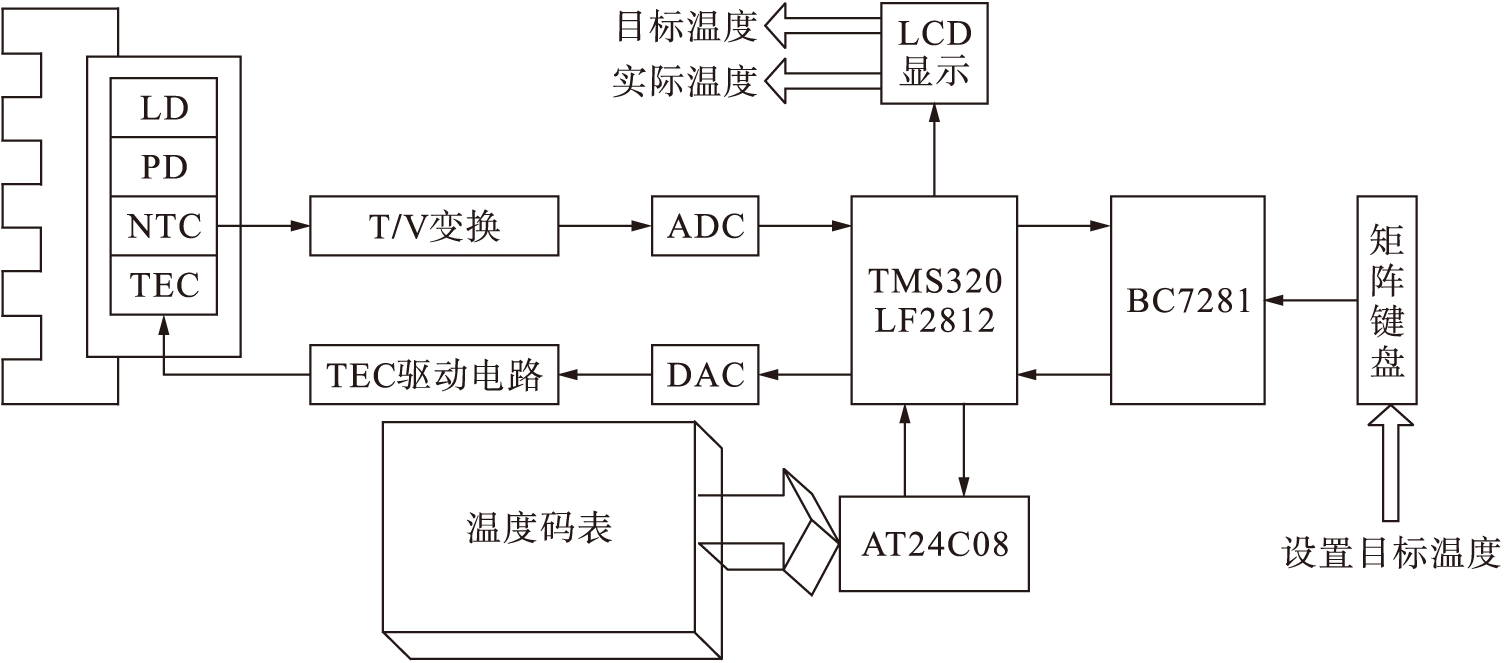 电压转换,然后将此电压信号经过16位模数转换(ADC)LTC1864送入DSP等待处理.2)温度控制单元.DSP将NTC采集到的表征当前温度的数字量与表征预置温度的数字量进行对比,进而调用内部遗传算法输出控制量,通过16位数模转换(DAC)LTC1655输出模拟量来使TEC加热或者制冷,使激光器温度改变.3)温度显示单元.DSP控制LCD1602完成两行显示,一行为预置温度,一行为当前温度.4)键盘单元.用来设置LD的温度、送加热、制冷以及启动与停止命令给DSP,矩阵键盘通过BC7281键盘接口专用控制芯片与DSP相连,仅需3个I/O口.5)温度数据存储单元.把有限多个整数温度点以数据表的形式存入8 kbit的EEPROM存储器AT24C08中,AT24C08与DSP以I2C总线连接,仅需两个I/O口.此外,为了保证温度控制与监测的准确,NTC、TEC与激光二极管(LD)、光电二极管(PD)要尽量在同一封装之内,外接热沉散热.