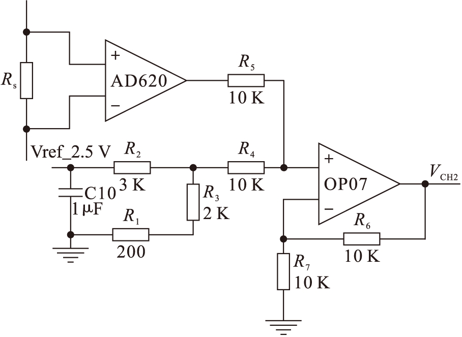 采样电阻Rs与AD620共同构成了电流取样放大电路,输出信号和背景信号一同送入比例加法电路.当无电流流经取样电阻时,AD620输出0 V电压,输出电压VCH2为背景信号.当有电流经过取样电阻时,AD620输出电压经过信号电平的平移,信号平移的幅度为背景电压大小.经过加法电路处理,输出信号均为正电压,经过ADC模块采集,送入微处理器进行处理.