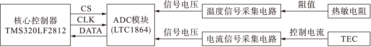 核心控制器TMS320LF2812通过温度信息采集后向通路来读取TEC控制电流的大小.判断TEC是否工作在正常状态,如果发生异常,通过对MAX1968使能引脚的拉低,切断TEC工作电流,以保护半导体激光器的正常运行.图3为温度采集单元组成框图.