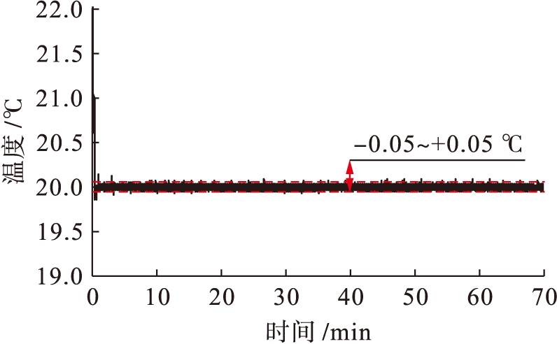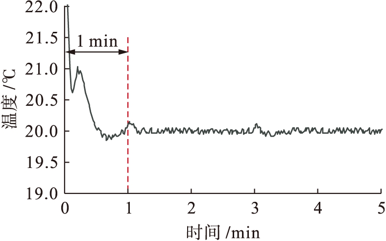 半导体激光器温度控制系统的响应时间测试结果如图7所示.通过对图7的实验数据进行分析可知,激光器温度控制器开始工作到激光器的实际温度达到设定值的时间大约为1 min.激光器的温度进入设定值后,温度在该值的-0.05~+0.05 ℃范围内变换,没有出现较大的跳变点.