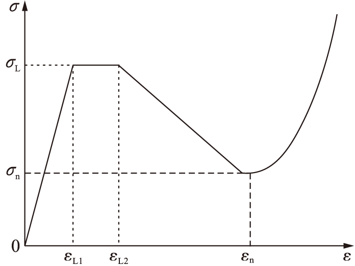 为了更好地了解木材在受力进程中应力和应变关系,建立静态压缩下建筑木材的应力应变关系如图1所示,其中,在0~εL1应变区域中,木材为线弹性阶段;在εL1~εL2的应变区域中,木材为塑性流动状态;在εL2~εn的应变区域中,木材为线性应变弱化状态;在ε>εn的应变区域中,木材处于幂强化阶段.本构关系可表示为