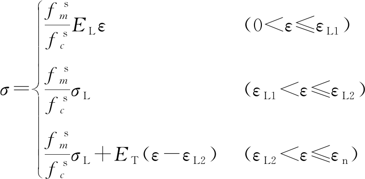 式中:EL为木材处于线弹性阶段时的弹性模量;ET为木材处于应变弱化阶段时的切线模量;σL为木材原始疏松组织线弹性阶段时的应力;εL1为木材进入塑性流动阶段时的应变;εL2为木材进入应变弱化阶段时的应变;εn为木材被压实时的应变;σn为木材被压实时的应力.