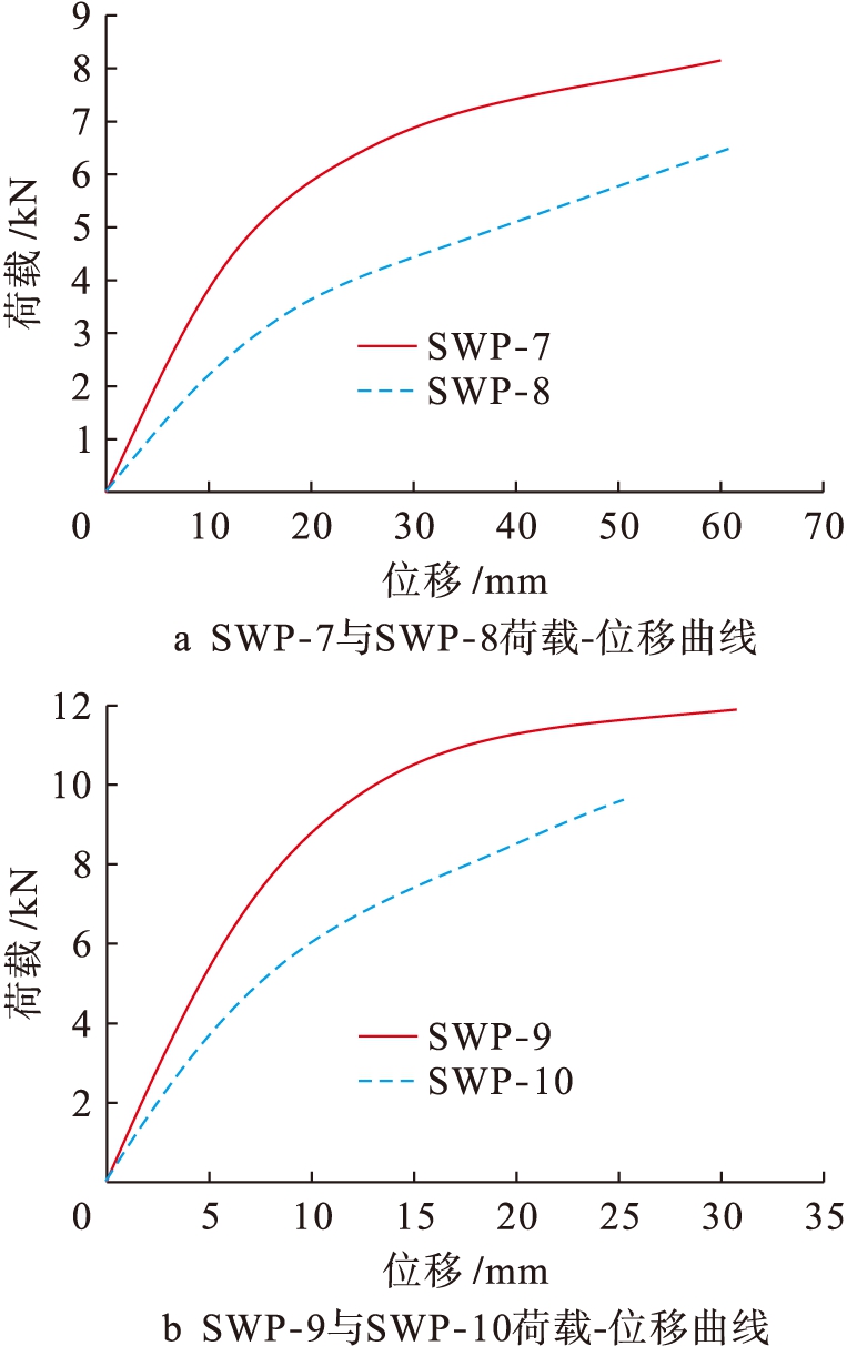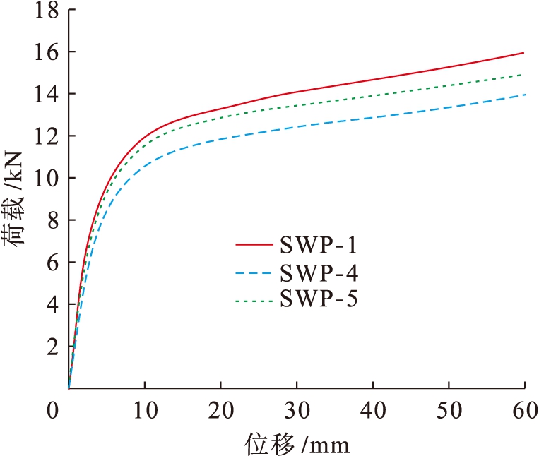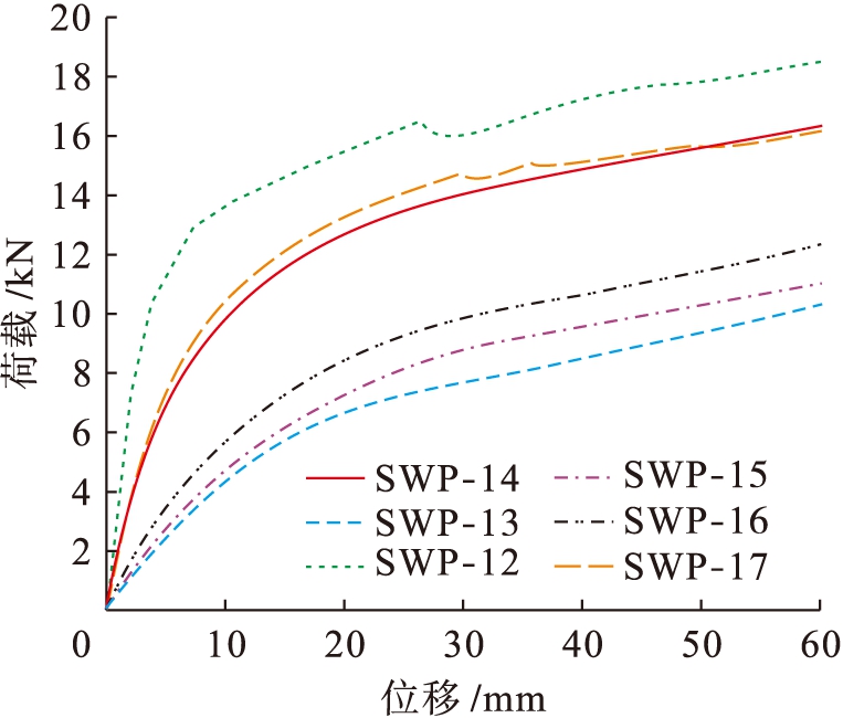 相比SWP-13,SWP-15(圆洞面积等于SWP-13)单位抗剪承载力提高约8%,两者初始刚度相当,SWP-16圆洞的面积小于SWP-15,且直径等于SWP-13方洞边长,其初始刚度提高约60%,单位抗剪承载力提高约20%;相较SWP-14,SWP-17(圆洞面积等于SWP-14)初始刚度下降10%,两者承载力相当.方洞与圆洞对组合墙抗剪性能的影响无明显差异,而洞口面积对组合墙抗剪性能影响显著.