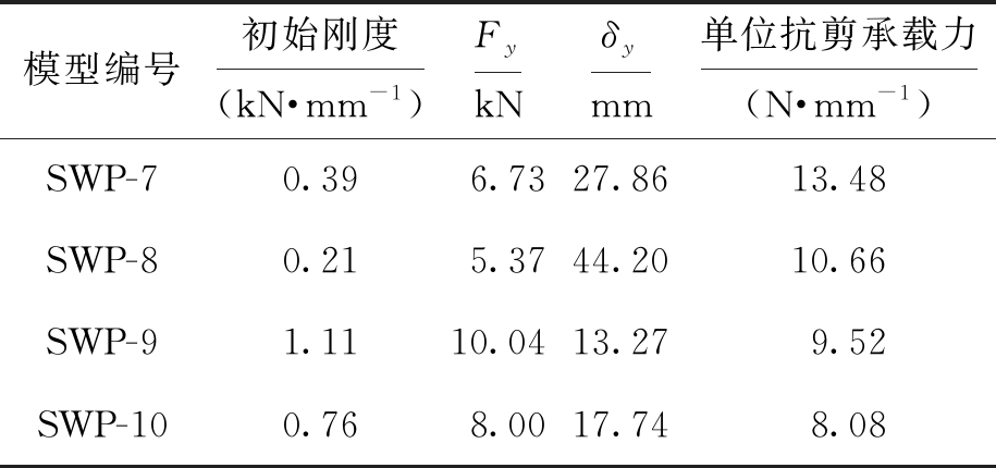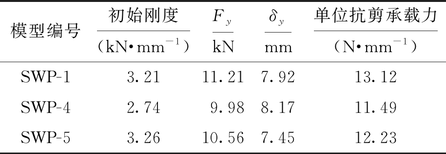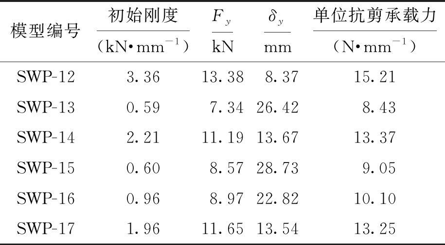 模型编号初始刚度(kN·mm-1)FykNδymm单位抗剪承载力(N·mm-1)SWP-13.2111.217.9213.12SWP-42.749.988.1711.49SWP-53.2610.567.4512.23