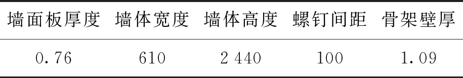 进行有限元计算模型参数分析时,所有骨架构件钢材选用Q345,SWP-1~SWP-6包括SWP-1(C)和SWP-6(T)的墙面板材料选用Q345,SWP-7~SWP-17的墙面板材料选用Q235;组合墙C型立柱和U型导轨的截面尺寸均为C152.4 mm×41.15 mm×12.7 mm和U152.4 mm×41.15 mm,具体模型参数如表3所示.