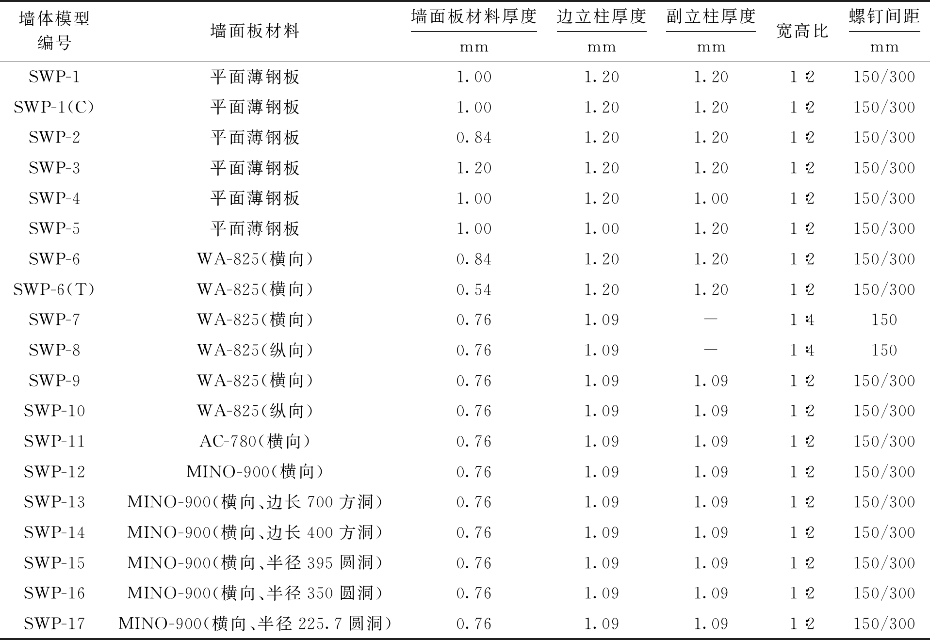 墙体模型编号墙面板材料墙面板材料厚度mm边立柱厚度mm副立柱厚度mm宽高比螺钉间距mmSWP-1平面薄钢板1.001.201.201∶2150/300SWP-1(C)平面薄钢板1.001.201.201∶2150/300SWP-2平面薄钢板0.841.201.201∶2150/300SWP-3平面薄钢板1.201.201.201∶2150/300SWP-4平面薄钢板1.001.201.001∶2150/300SWP-5平面薄钢板1.001.001.201∶2150/300SWP-6WA-825(横向)0.841.201.201∶2150/300SWP-6(T)WA-825(横向)0.541.201.201∶2150/300SWP-7WA-825(横向)0.761.09-1∶4150SWP-8WA-825(纵向)0.761.09-1∶4150SWP-9WA-825(横向)0.761.091.091∶2150/300SWP-10WA-825(纵向)0.761.091.091∶2150/300SWP-11AC-780(横向)0.761.091.091∶2150/300SWP-12MINO-900(横向)0.761.091.091∶2150/300SWP-13MINO-900(横向、边长700方洞)0.761.091.091∶2150/300SWP-14MINO-900(横向、边长400方洞)0.761.091.091∶2150/300SWP-15MINO-900(横向、半径395圆洞)0.761.091.091∶2150/300SWP-16MINO-900(横向、半径350圆洞)0.761.091.091∶2150/300SWP-17MINO-900(横向、半径225.7圆洞)0.761.091.091∶2150/300