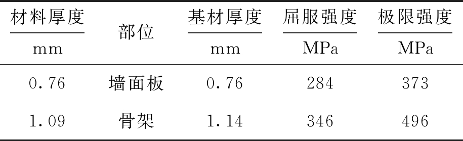 材料厚度mm部位基材厚度mm屈服强度MPa极限强度MPa0.76墙面板0.762843731.09骨架1.14346496