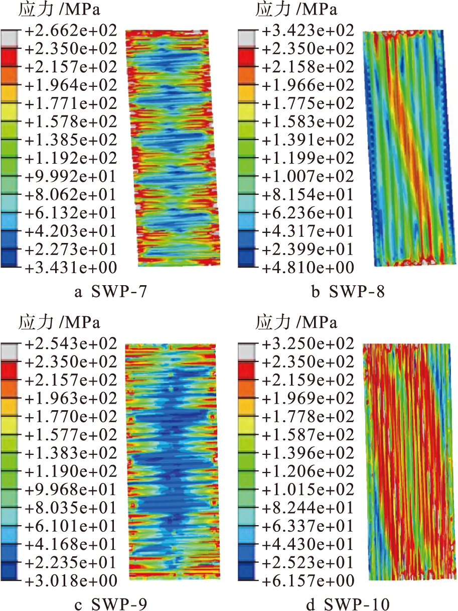 计算结果如图7、8和表7所示.高宽比为4∶1时,SWP-7比SWP-8承载力提高了26.45%,初始刚度提高85.71%;高宽比为2∶1时,SWP-9比SWP-10承载力提高了17.82%,初始刚度提高了46.10%.在两种高宽比下,横向波纹覆面组合墙承载力和初始刚度均高于纵向波纹覆面组合墙.