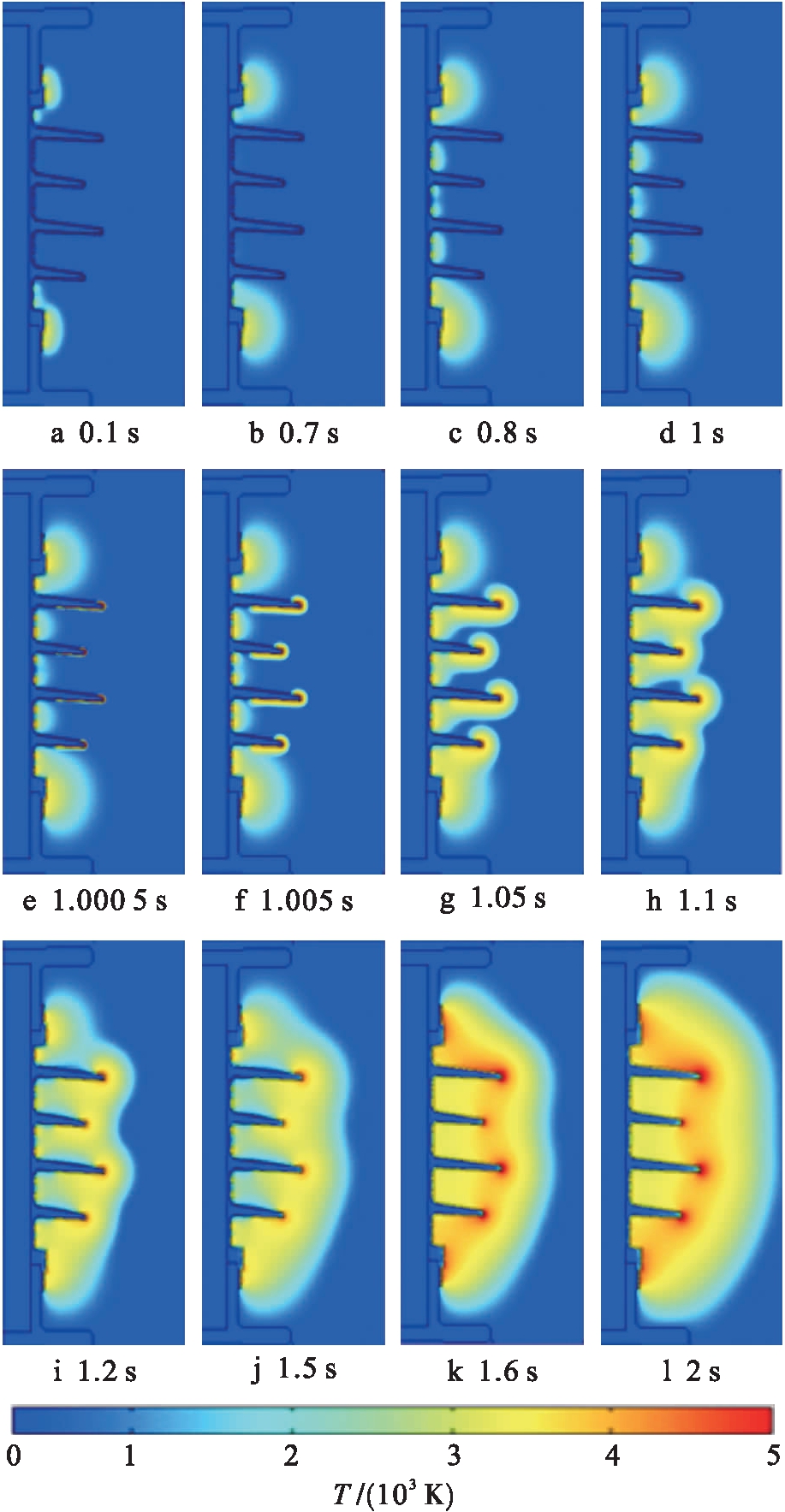 图6、7分别为污闪动态发展过程的温度场、电场分布云图.污闪全过程分为3个阶段:局部电弧产生阶段、局部电弧桥接阶段和沿面闪络阶段.