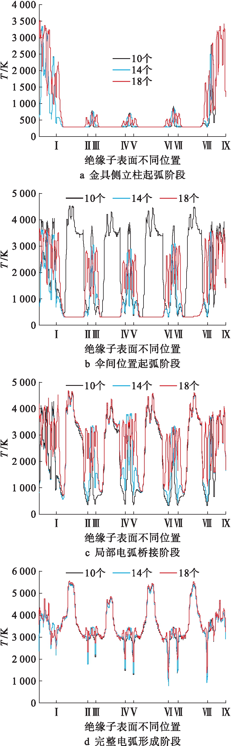图10为不同干区个数时各阶段绝缘子表面温度,图10a上金具侧0-Ⅰ位置只有10个干区与14个干区情况下温度曲线重合.由伞间立柱温度可知,干区个数越多,局部高温位置越多,且对相邻位置湿区的烘干作用较干区少时明显,但温度最大值却随干区个数的增加而减小,这是因为随着干区个数的增多,单个干区分压减少.图10b为伞间起弧阶段,此时干区数目少,单个干区分压高,所以伞裙位置由于尖端结构能较早被烘干,出现局部电弧温度升高,局部电弧更容易发展.图10c为局部电弧桥接阶段,可见不同干区个数对伞裙上的电弧温度无影响,但伞间立柱区电弧温度在14个干区分布时最高,主要原因是干区数为10时,升温速度快,但随着局部电弧不断发展,使周围出现干区的概率较小;而干区数为18时,立柱上局部电弧较多,但每个电弧的相对能量有所降低,因此温度值没有14个干区时大.图10d为完整电弧形成阶段,整个绝缘子沿面的温度较之前各阶段都有所升高,高温区域仍处于各伞裙尖端,此时干区个数对局部电弧温度无显著影响.