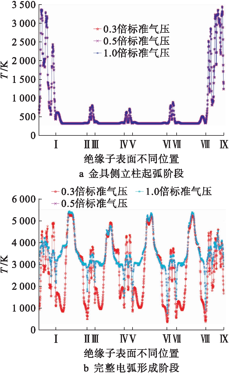 在金具侧立柱起弧阶段、伞间位置起弧阶段和局部电弧桥接阶段的温度曲线在3种大气压强下基本重合,只是各阶段的温度值有所不同,但在完整电弧形成阶段时的温度曲线有了明显差异,故图11只列出起弧阶段和完整电弧形成阶段绝缘子表面温度数据图.如图11a所示,压强对绝缘子起弧和桥接阶段影响不大,这是因为局部电弧发展前期电弧形态还不稳定,泄漏电流比较小,主要依靠静电力沿绝缘子表面逐步发展,飘弧作用不显著.闪络阶段如图11b所示,0.5与1倍标准大气压的绝缘子沿面温度曲线变化规律一致.0.3倍标准大气压时,金具侧及金具侧立柱0-Ⅰ和3个伞间立柱Ⅱ-Ⅲ、Ⅳ-Ⅴ、Ⅵ-Ⅶ温度值变化规律相同,说明较低气压时电弧飘弧现象对绝缘子沿面温度产生了一定影响,飘弧现象会使电弧之间的桥接更容易,使相邻干区跨越过湿区直接桥接.伞裙位置温度变化规律分为伞裙上下表面及尖端位置处的差异,伞裙尖端位置3种大气压强下温度值基本相同,而伞裙上下表面温度在0.3倍标准大气压时比其他两种情况时低很多,尖端位置3种情况一致是因为电流密度较大,弧足向前延伸的作用明显,飘弧现象会被削弱;而在伞裙上下表面飘弧现象显著,从而使原本的高温区域发生位移改变.