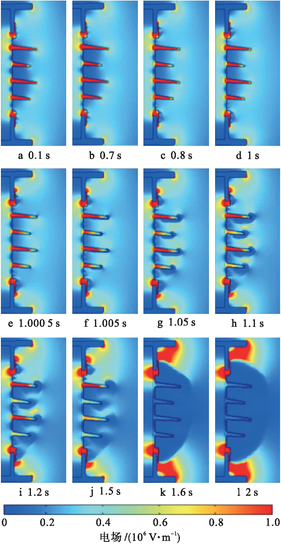 随着立柱上各局部电弧之间距离减小,相互之间的桥接产生,如图6第2行图片序列所示,紧随立柱上干区发展之后,伞裙尖端及下表面温度也渐渐升高,说明这些地方慢慢满足了产生局部电弧的条件.图7中第2行图片刚开始伞裙尖端的电场较第1行图片序列中有所降低,因为局部电弧产生后电阻率下降,同理伞裙下表面的电场也降低了.随着电阻率的下降,漏电流开始增加,干区面积越来越大,干区分担的电压也增高,局部电弧的能量较之前有了很大提升,相互发生桥接.