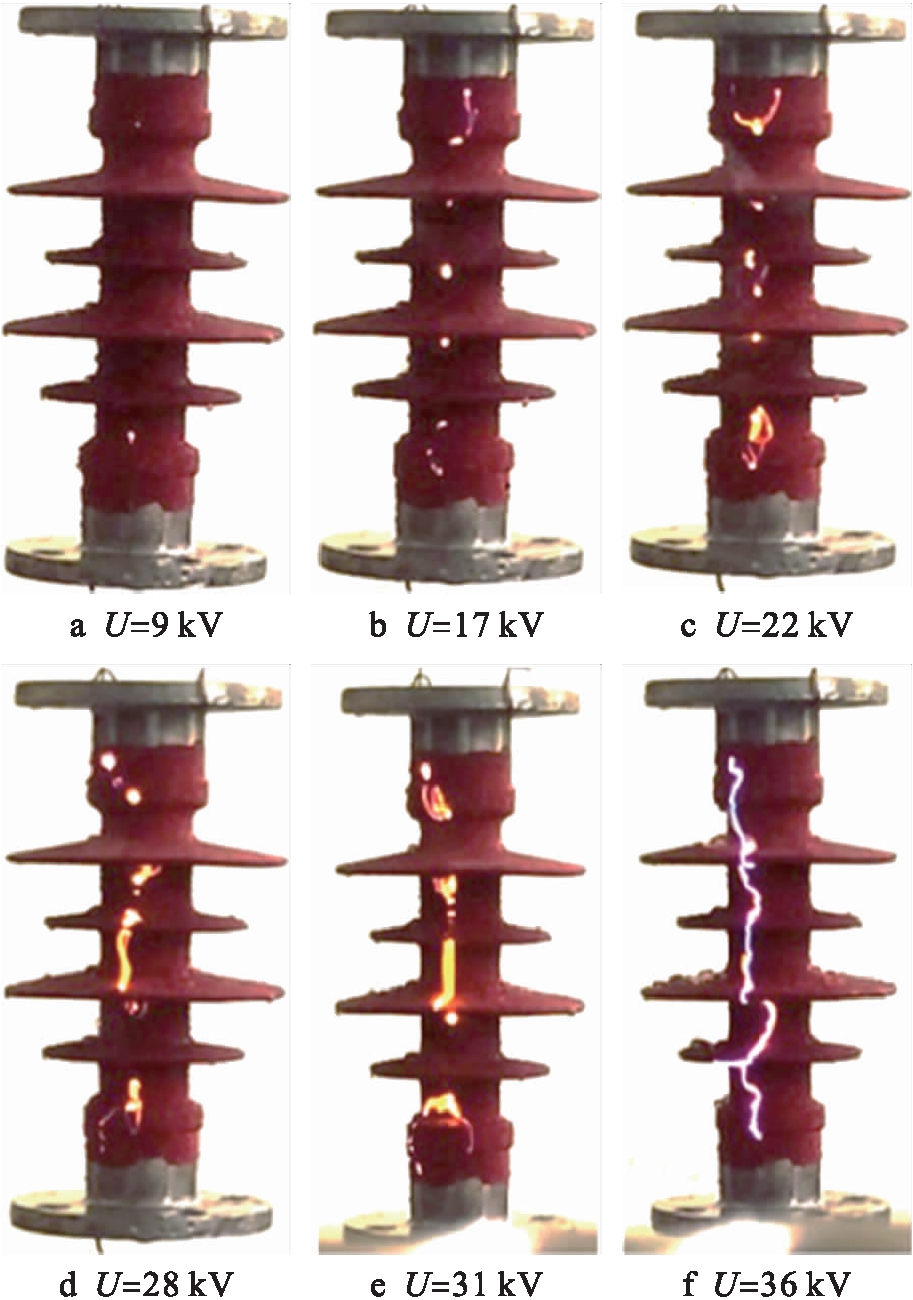 从图4可以看出,最易产生局部电弧的位置是距离高压端较近的立柱.随着电压的增加,伞裙间隙的立柱出现了干区,随之多个局部短电弧形成,它们与剩余污层串联分布在绝缘子表面.电压升到22 kV时,局部电弧亮度更大,金具两侧局部电弧的长度也有了明显增加;继续增加电压至28~31 kV时,各局部短电弧之间发生了桥接,形成长弧;电压达到36 kV时,电弧沿着伞裙间的立柱发展到伞裙上、下表面,连成一条沿整个绝缘子表面的完整电弧,整个发展过程即为绝缘子的闪络过程.