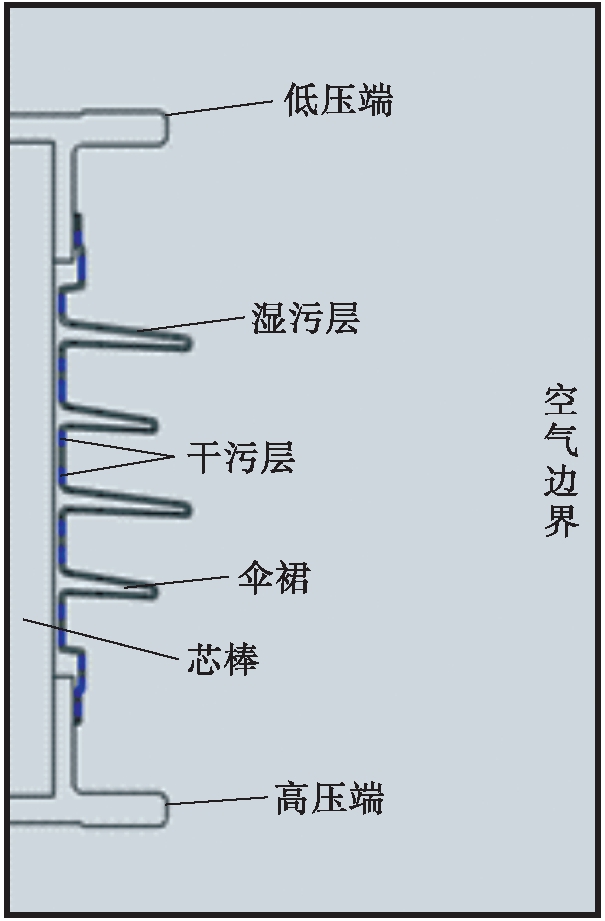 本文仿真模型以FZSW-10/4复合支柱绝缘子的实际尺寸为依据建立,绝缘子表面污层厚度设为1 mm.绝缘子表面污秽的分布有很强的不均匀性,本文基于奥本斯诺污闪放电模型,假设仿真模型中干污和湿污交替分布,几何模型如图5所示.仿真模型共用到6种材料,材料的具体参数如表2所示.