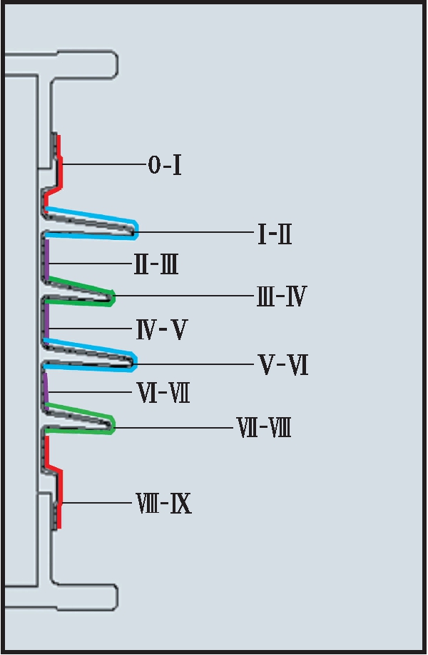 0-I:上金具侧和上金具侧立柱;Ⅰ-Ⅱ:大伞裙1;Ⅱ-Ⅲ:伞间立柱1;Ⅲ-Ⅳ:小伞裙1;Ⅳ-Ⅴ:伞间立柱2;Ⅴ-Ⅵ:大伞裙2;Ⅵ-Ⅶ:伞间立柱3;Ⅶ-Ⅷ:小伞裙2;Ⅷ-Ⅸ:下金具侧和下金具侧立柱.