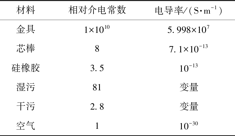 材料相对介电常数电导率/(S·m-1)金具1×10105.998×107芯棒87.1×10-13硅橡胶3.510-13湿污81变量干污2.8变量空气110-30
