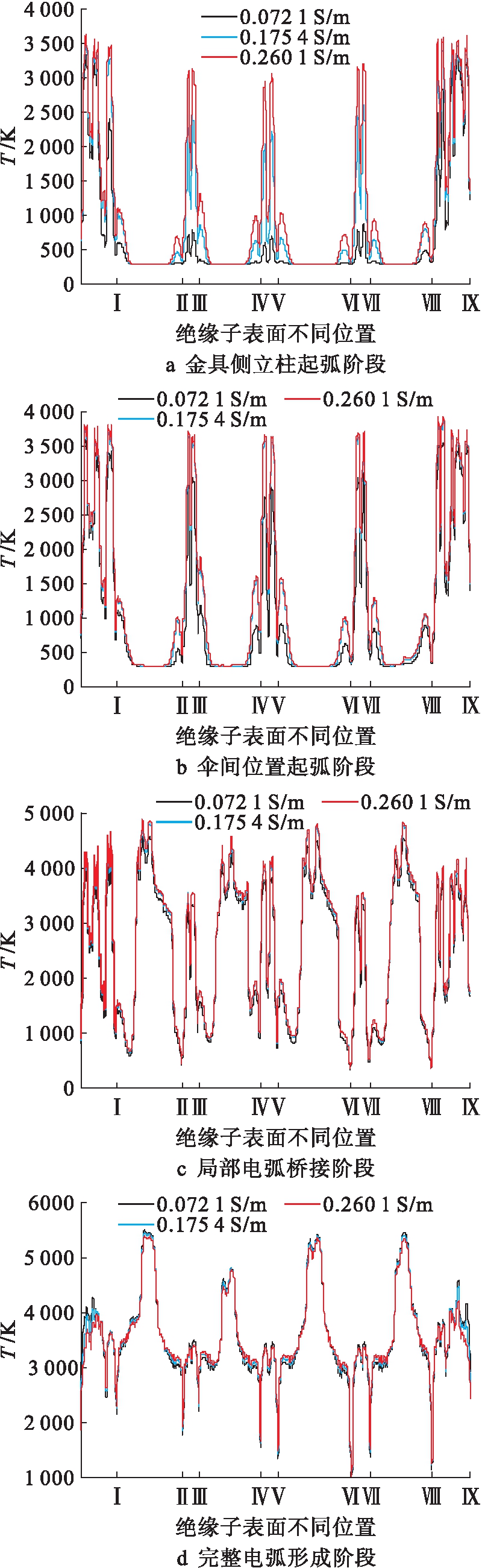 由图9a~b可知,在起弧阶段电导率对温度值影响较大,污秽电导率越大,局部电弧的温度越高.图9a为最初的阶段,整个绝缘子沿面的最大温度值约为3 500 K,且三个伞间立柱Ⅱ-Ⅲ,Ⅳ-Ⅴ,Ⅵ-Ⅶ的位置也已开始起弧.图9b与图9a相类似,但温度峰值有所升高,这是由于多个局部电弧形成,泄漏电流变大,电流的热效应增强所致,伞裙处温度依然偏低,因为此阶段伞裙处还未形成局部电弧.图9c~d表明电弧桥接之后,电导率对绝缘子沿面各处的温度影响不再显著,因为电弧桥接之后的温度主要依赖于等离子体中的热电离.如图9c所示,伞裙起弧后局部电弧温度上升,尖端结构导致图9d中完整电弧形成之后,弧柱通道主要分布在各伞裙尖端.小伞裙1的尖端位置(Ⅲ-Ⅳ的中间位置)较其他伞裙尖端温度最大值低,这是因为相邻两伞裙为大伞裙,大伞裙尖端电弧桥接到小伞裙尖端需要的路径比两大伞裙尖端相桥接路径长,途中有一部分能量会散失,而小伞裙2 Ⅶ-Ⅷ与高压端金具相邻,所以此小伞裙尖端的温度较小,伞裙1的温度较高.
